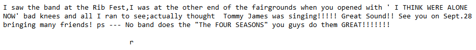 "Just checked out the songs on your website, nice job, about as close to the originals as I've ever heard any band cover a song-- even the tribute bands. You guys are fortunate too to have a good tenor who can cover songs like Sherry and Faithfully. "...Steve