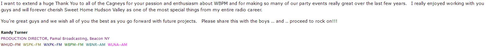 "WOW!!!!!!!!!!!!!!!! You blew the Village away. They made me promise to have you return again next summer for another performance. John (Skinny) Regan sends his compliments. He thought you were fantastic and honestly speaking the best and most professional band to perform in the Park. Thank you for a wonderful evening. The Wappingers Falls Business & Professional Association was very proud to have sponsored the concert."...Cindy L.