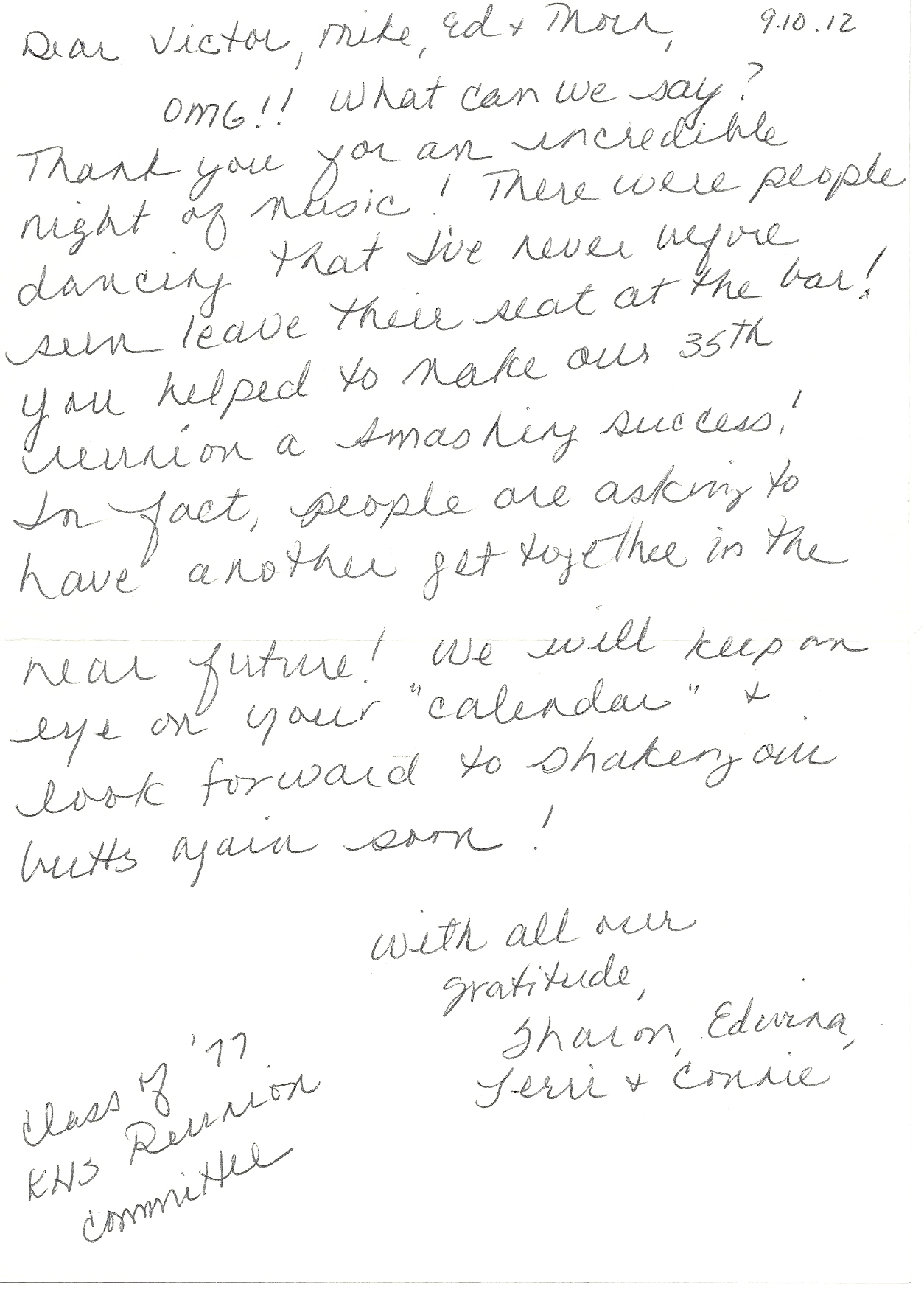 "Thank you Cagneys for making the KHS Class of 77' 35th reunion a rockin event. As always your guys were awesome and made the night extra special !!!!"...Terri B.