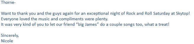 "It was a pleasure hearing you guys the other night at Skytop. I was singing in my seat and just loving it. You guys were great and hope to hear you more often. Im new to area and love it here so knowing you guys just made it better. Blessings and keep jamming."...Jose D.